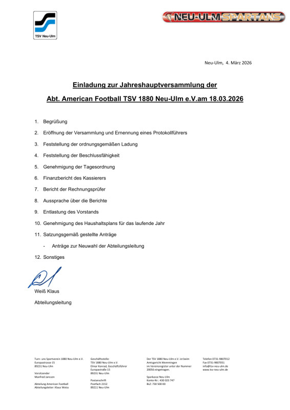 Sehr geehrte Mitglieder der Abteilung American Football „Neu-Ulm Spartans“,