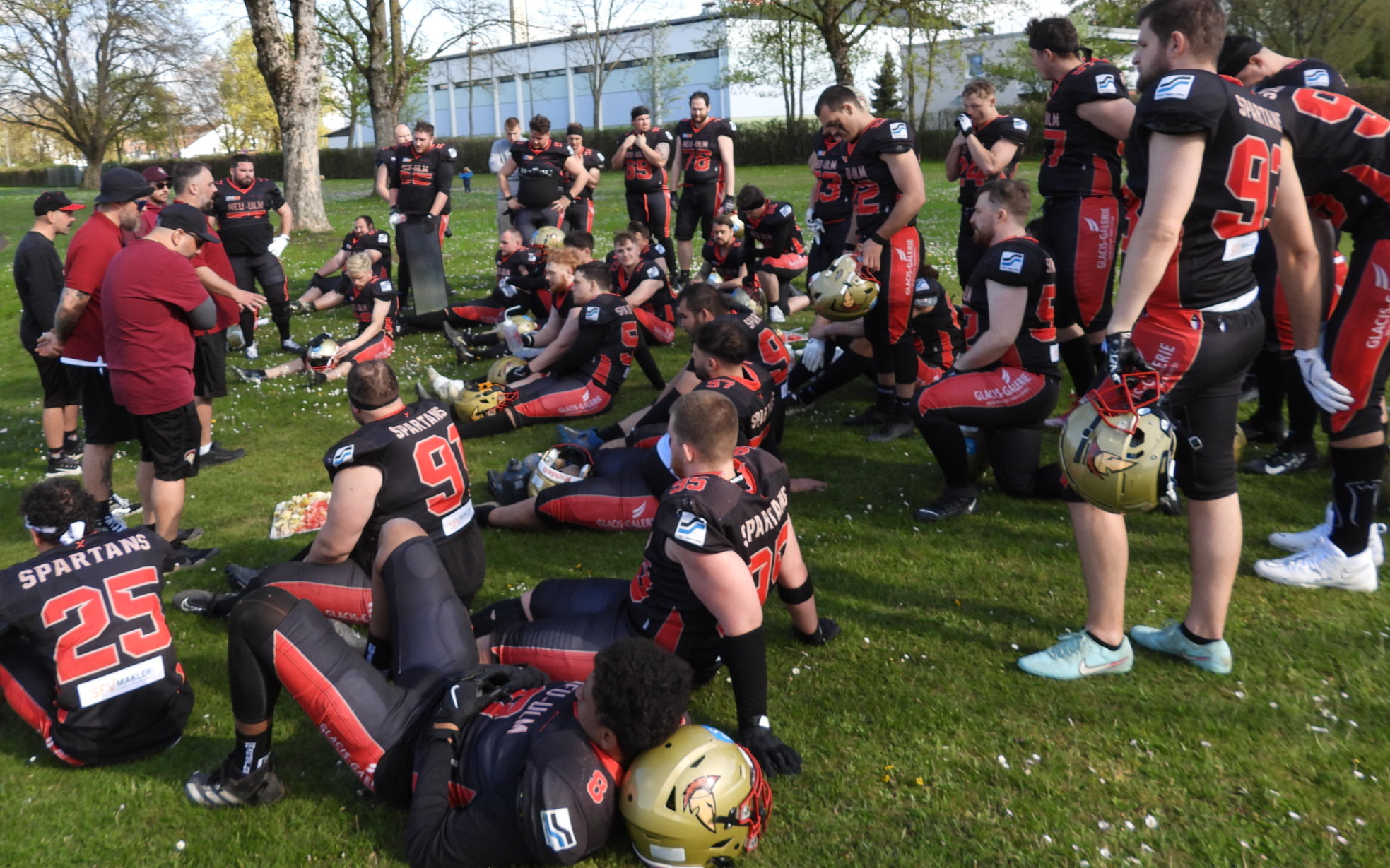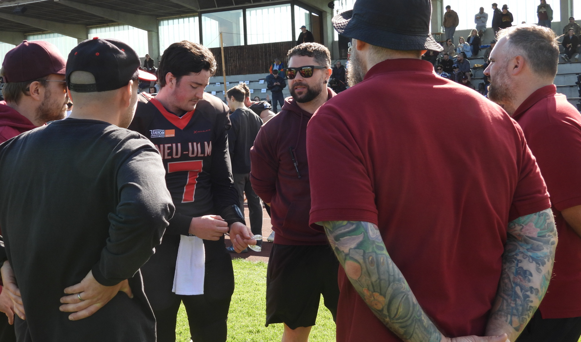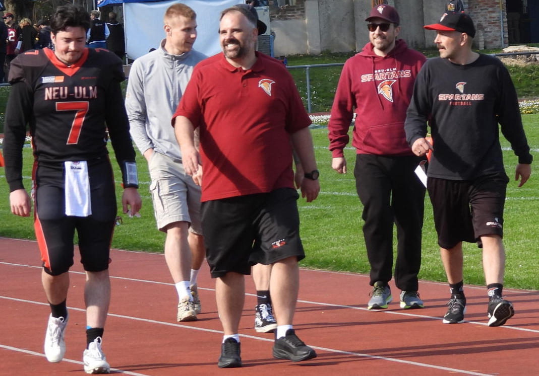 Gemeint ist Patrick Schempf (auf dem Foto oben mit Sonnenbrille) , bekanntlich über viele Jahre eine ganze starke Waffe in der Spartans-Offense, der ganz kurzfristig vom bisherigen Offense Coordinator Marius Fischer dessen Rolle an der Sideline übernehmen musste, nachdem Fischer just in der Woche ein tolles berufliches Angebot aus den USA erhalten und auch angenommen hatte.