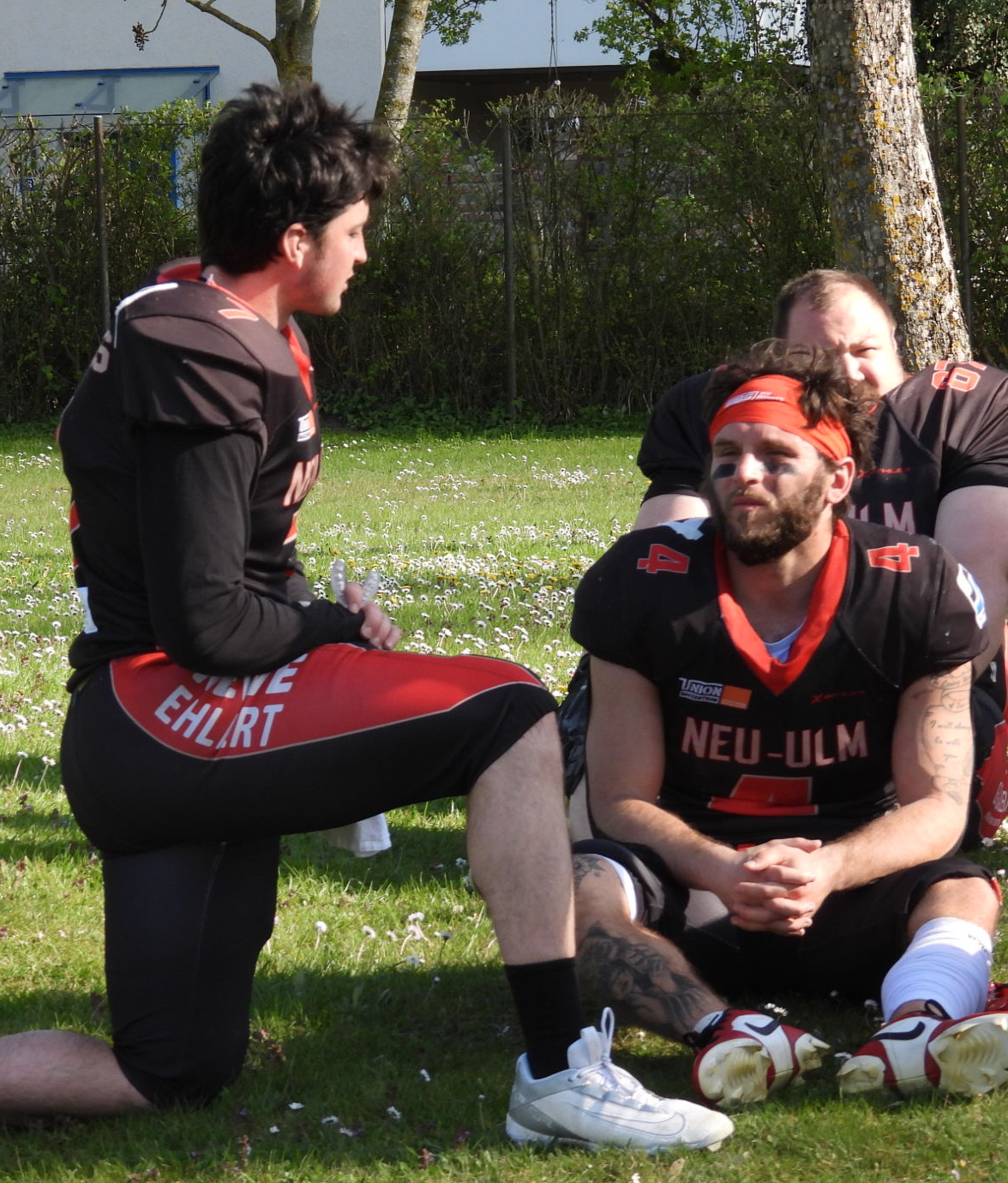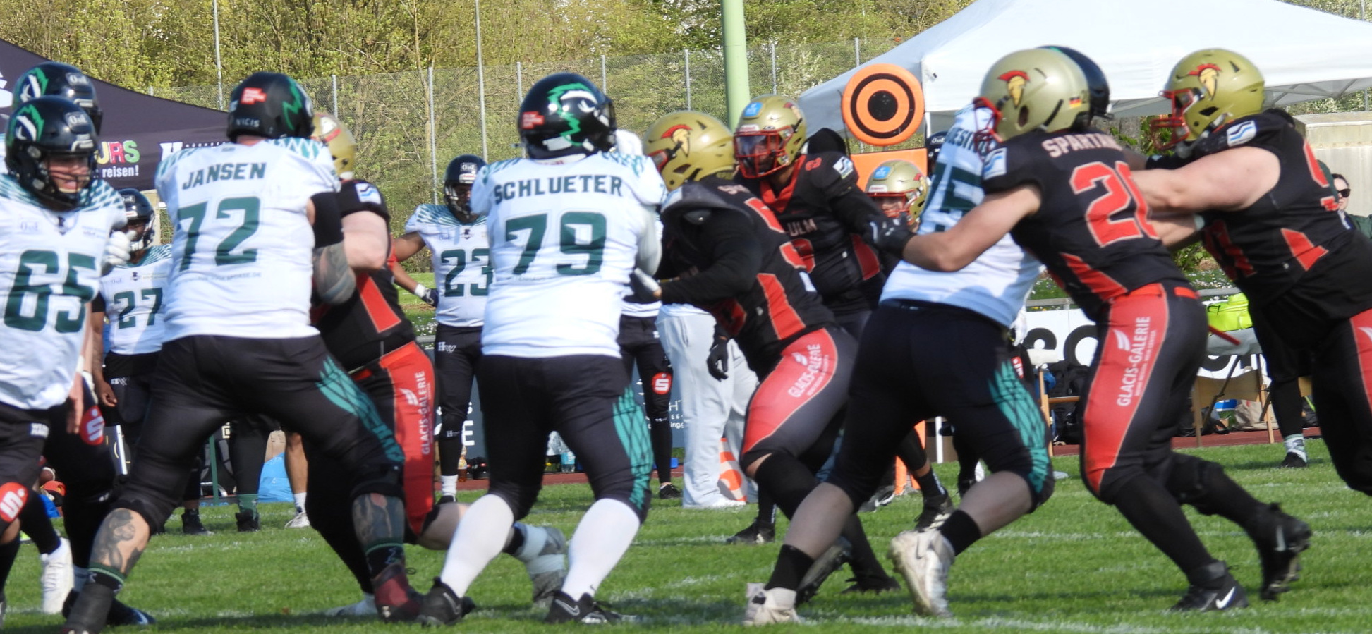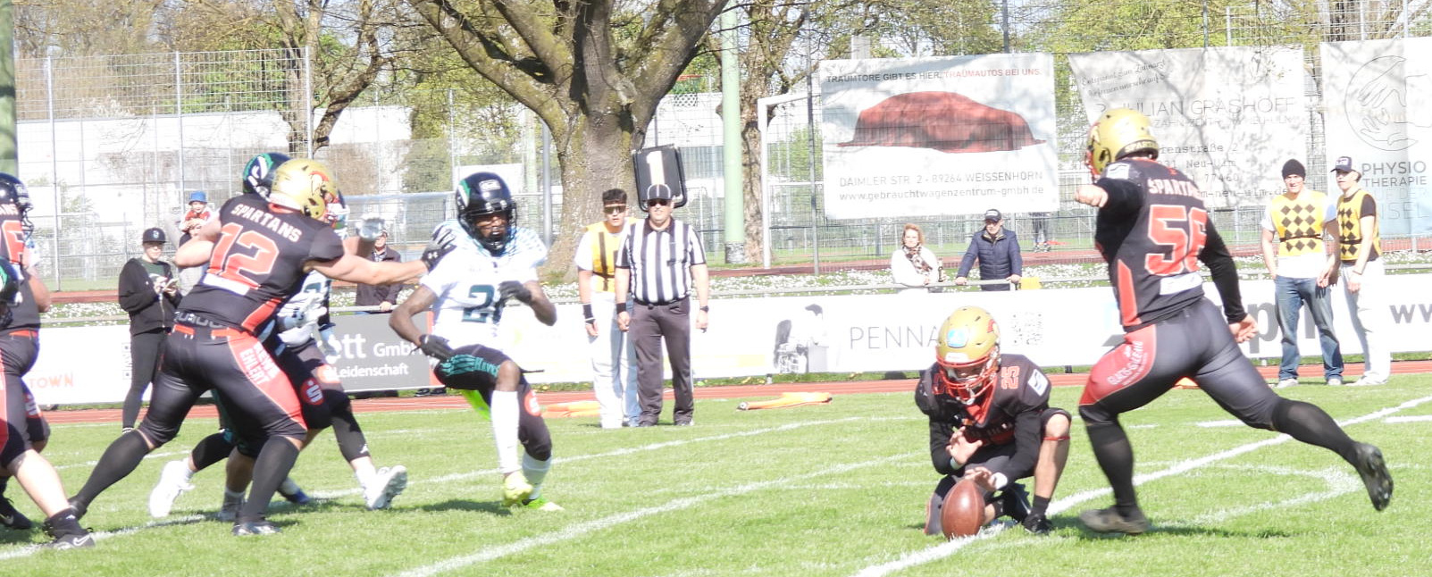 Gemeint ist Patrick Schempf (auf dem Foto oben mit Sonnenbrille) , bekanntlich über viele Jahre eine ganze starke Waffe in der Spartans-Offense, der ganz kurzfristig vom bisherigen Offense Coordinator Marius Fischer dessen Rolle an der Sideline übernehmen musste, nachdem Fischer just in der Woche ein tolles berufliches Angebot aus den USA erhalten und auch angenommen hatte.