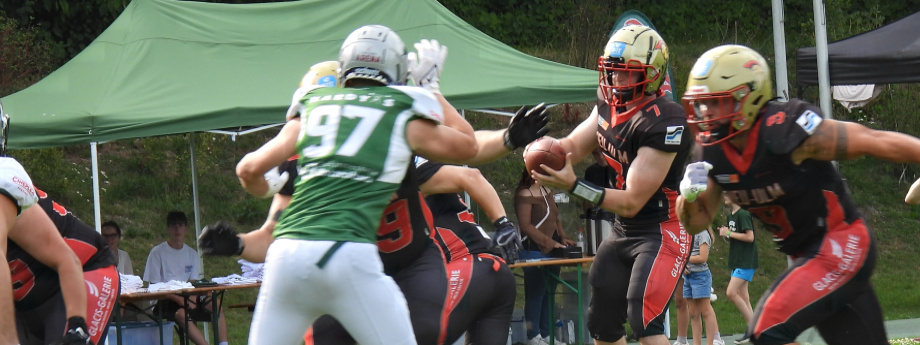 Aber dann – im vierten Spielabschnitt erlief Hunter Sturgeon einen TD, verteilte den Ball gut an seine Receiver Wesley Juszczak, Patrick Schempf (#9) und Tobias Spohn (#81) und Running Back Felix Klein (#30) krönte seine sehr gute Leistung mit einem Lauf-TD sowie mit einem gefangenen TD nach Pass von Sturgeon. Linebacker Max Walser verwandelte alle drei PAT gewohnt zuverlässig und verhinderte darüber hinaus einen weiteren Landsberger Punt im Ansatz, indem er den Punter zu Boden brachte, bevor dieser den Ball los werden konnte.