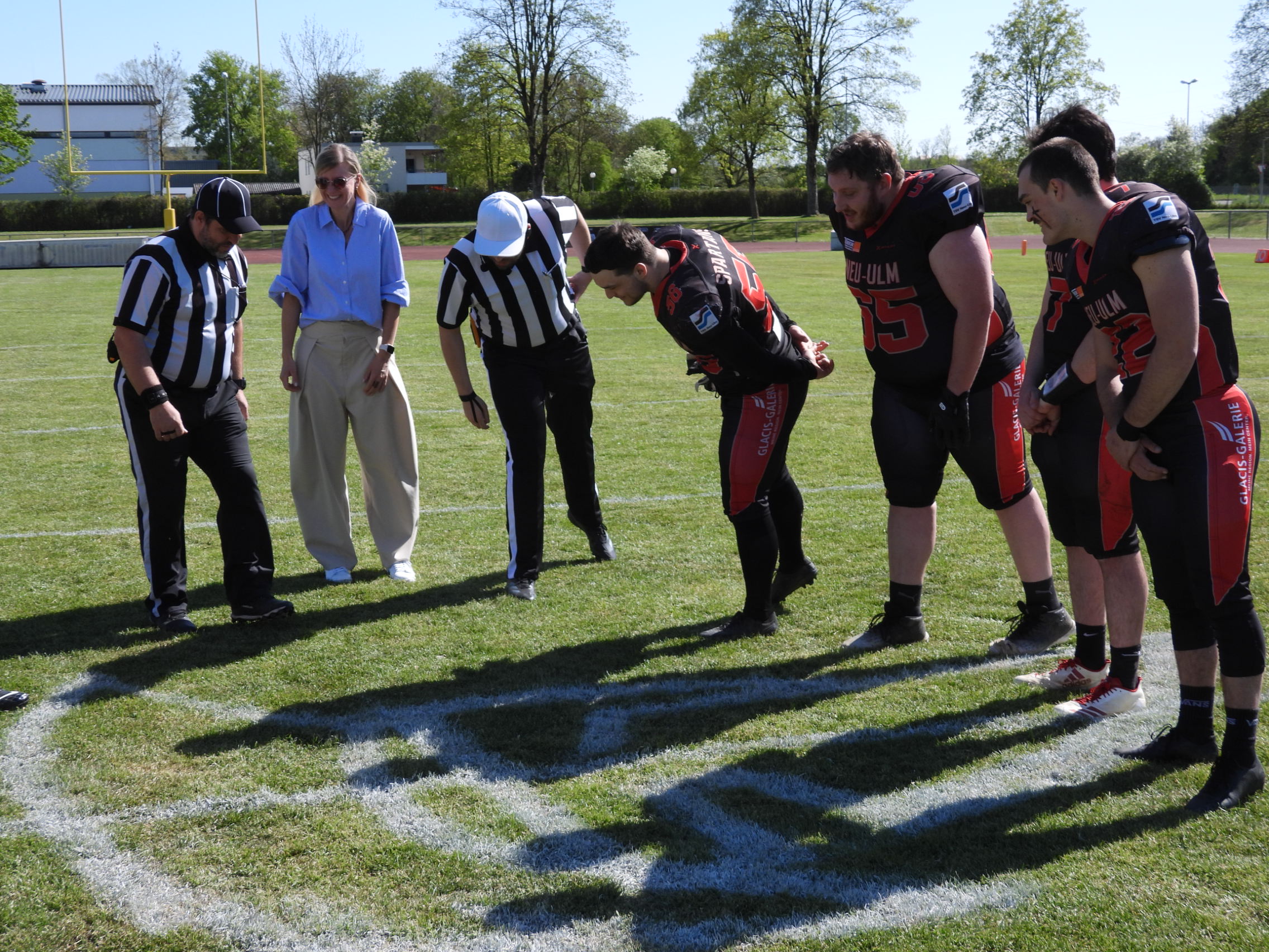 Die Neu-Ulmer Football-Cracks wollten die ärgerliche Niederlage beim Saison-Auftakt so schnell wie möglich abhaken, wollten gleich im zweiten Spiel alles besser machen. Das Vorhaben gelang weitestgehend: Die TSV Neu-Ulm Spartans bewiesen eindrucksvoll sich und den begeisterten Fans im Match gegen den zweiten Aufsteiger, die Munich Cowboys II, wie unnötig das knappe 7:13 gewesen war. Die Besucher im Dietrich-Lang-Sportzentrum – darunter auch Neu-Ulms OB Katrin Albsteiger, die der Einladung zum Münzwurf (coin toss) gefolgt war, – erlebten bei strahlendem Sonnenschein diesmal eine bestens aufgelegte Offense. Und da die Defense wie im ersten Match gegen die Hawks auch die Offense der Cowboys weitgehend neutralisierte, stand am Ende ein glattes 45:15 (7:9 / 14:6 / 7:0 / 17:0).