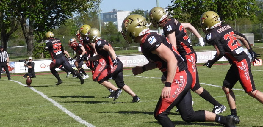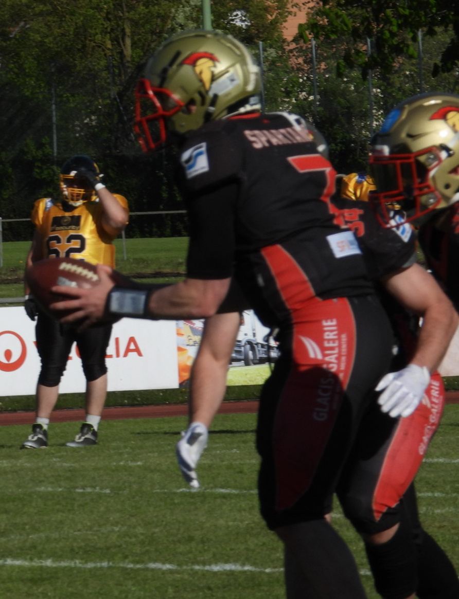 Dabei hatte es zum Start der Begegnung noch ausgesehen, als ob es gerade so weitergehen würde, wie es gegen Nürnberg geendet hatte: Nach ihrer Spiel-Eröffnung wurden die Spartans kalt erwischt durch einen sehr langen Kickoff Return der Gäste, die danach ruck-zuck den ersten Touchdown (TD) erzielten. Den Extrapunkt (PAT) konnte die Spartans-Defense allerdings blocken und so blieb es zunächst beim 0:6.