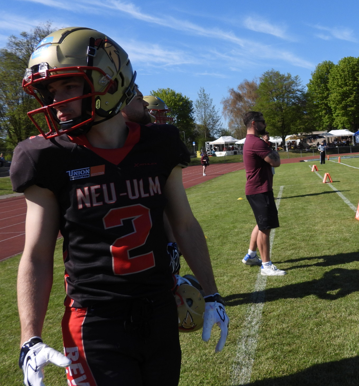 Die Neu-Ulmer Verteidigung wollte es den Kollegen in der Offensive gleichtun und zwang, bestens aufgelegt, die Hauptstädter nach nur drei Spielzügen zum Punt. Mainka und Bahadir marschierten danach weiter wie gehabt, bevor Luca Stieglbauer (#2) einen tollen 20-Yard-Catch nach Pass von Sturgeon zum 21:9 fing (PAT wieder durch Max Walser). Beide Teams konnten jeweils ihre nächsten Chancen nicht nutzen, sondern mussten punten und damit ihr Angriffsrecht wieder abgeben. Die Defense war vielleicht mit den Gedanken wohl schon in der Pause und schenkte dem Gegner praktisch in letzter Sekunde vor dem Halbzeit-Pfiff einen TD. Weil ein PAT aber erneut verhindert werden konnte, stand es zur Pause 21:15.