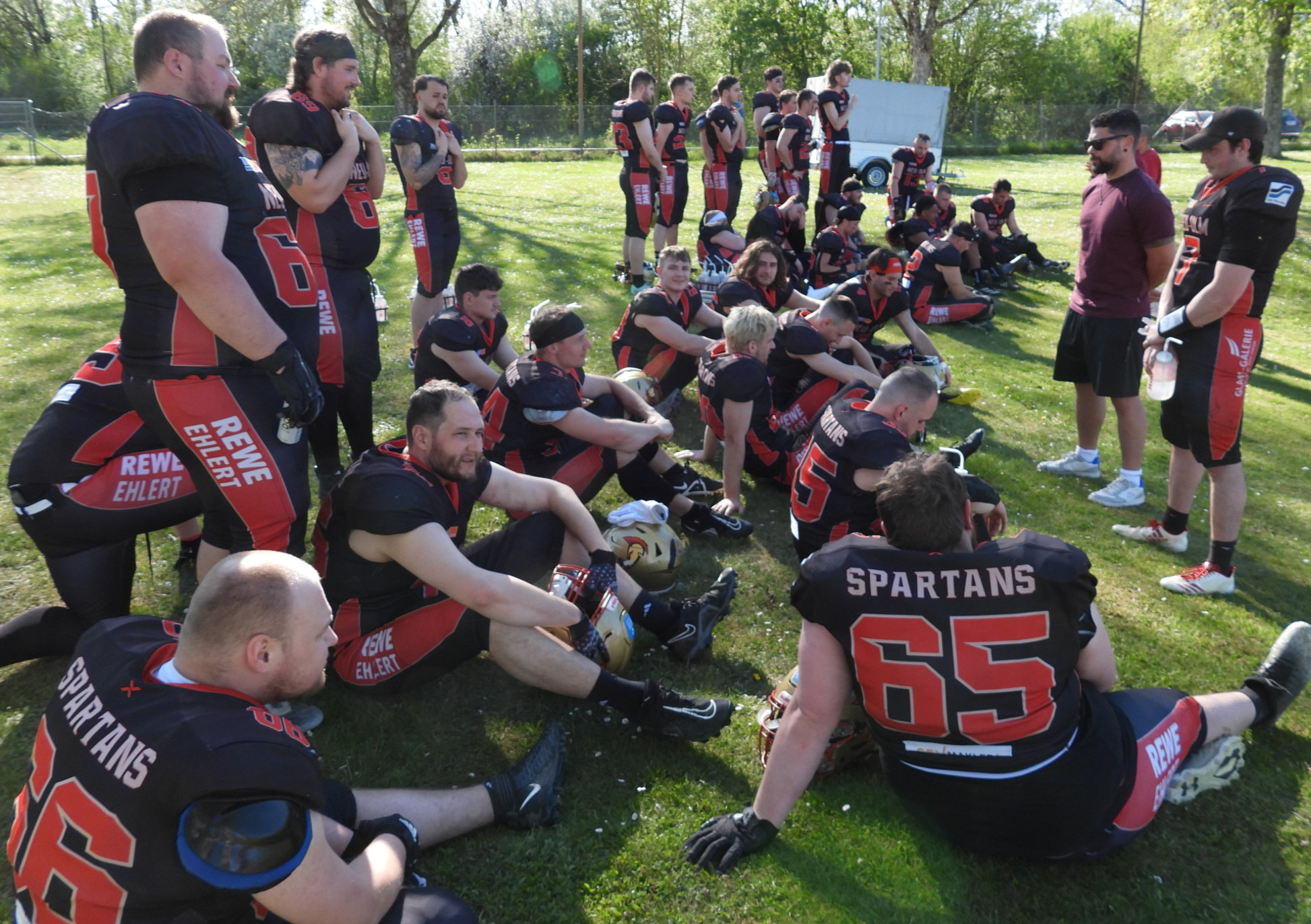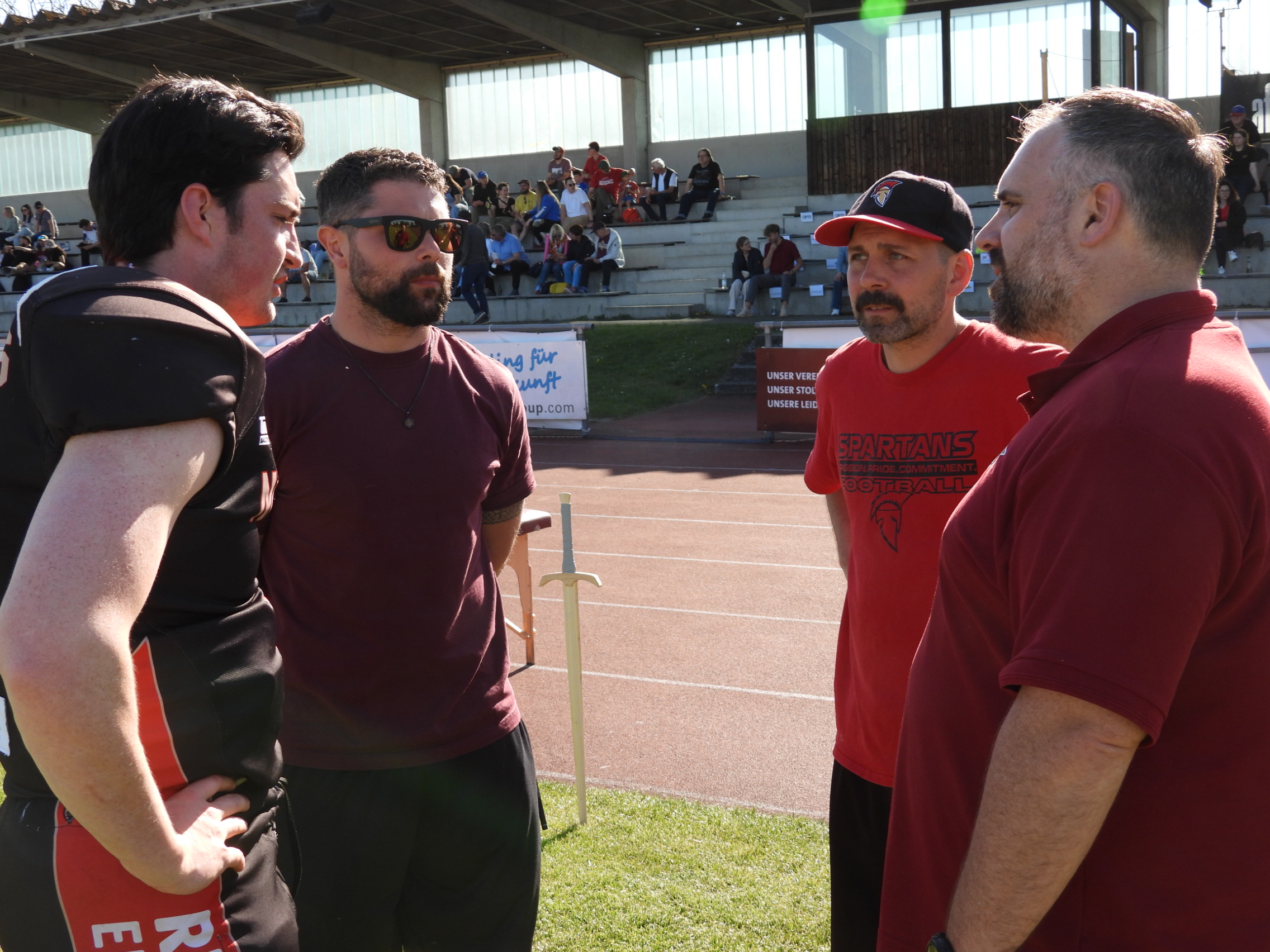 „Der Touchdown vor der Halbzeit war ärgerlich, da war unsere Abstimmung nicht rund“, so Spartans-Headcoach (HC) Daniel Koch (auf dem obigen Foto rechts vorn). „Es war aber schön zu sehen, dass vor allem das Laufspiel wieder funktioniert hat. Das öffnet Chancen für Pässe und damit kontrollierst du Uhr und Spiel.“