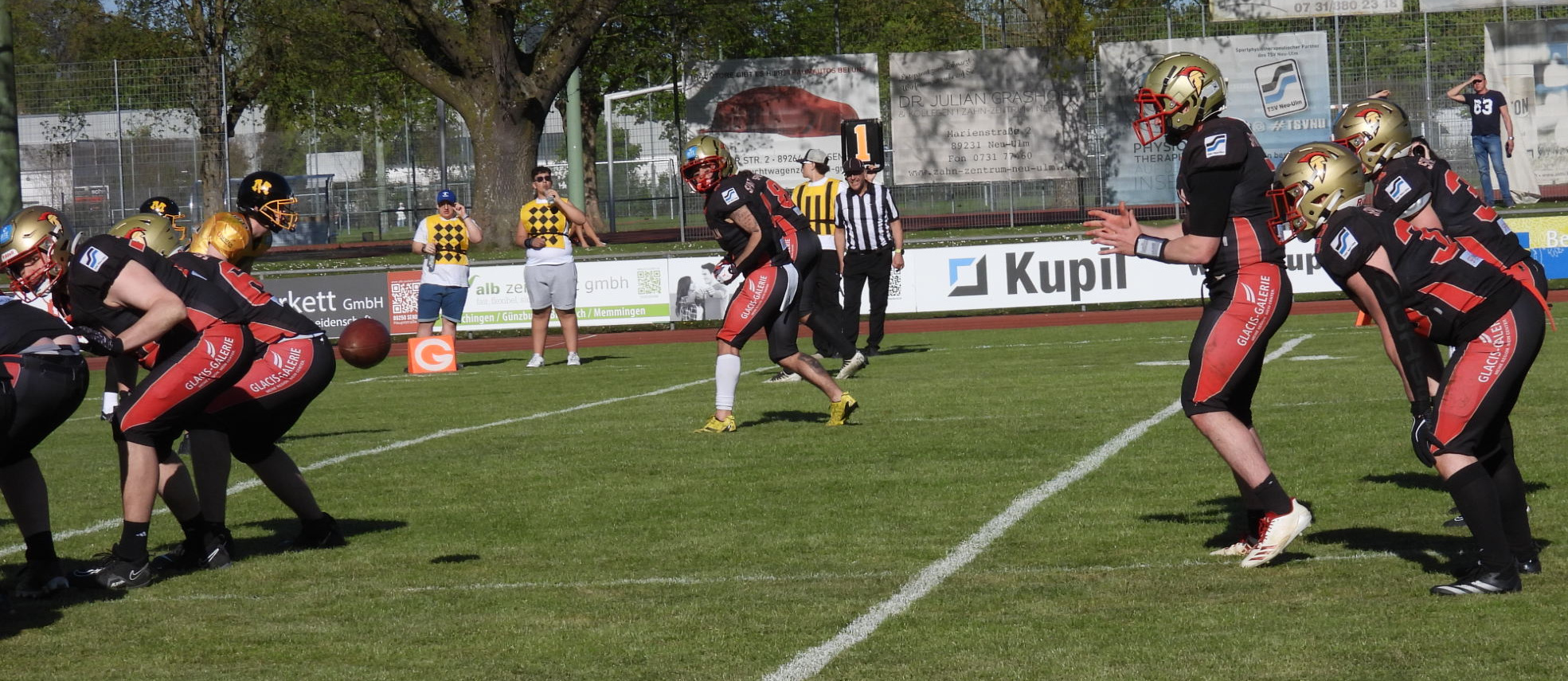 Aber dann: War beim Saisonauftakt insbesondere der Neu-Ulmer Angriff einfach nicht in in die Gänge gekommen, blieben die Männer um Quarterback (QB) Hunter Sturgeon (#7) dieses Mal von Anfang an ganz cool und gingen postwendend in Führung: Schon im dritten Offense-Spielzug bediente der Spielmacher seinen Receiver Nick Alberto (#4) mit einem langen Pass zum 6:6. Nach erfolgreichem PAT durch Max Walser (#56) stand es also gleich mal 7:6.